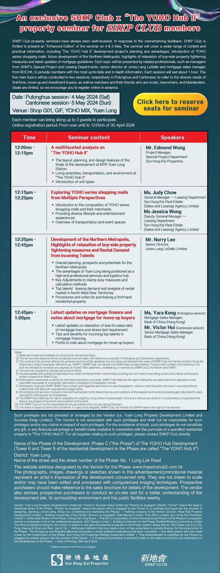 Being our valuable member, we thank you for your continuous support and from time to time we will share with you the latest information about SHKP and SHKP Club which might interest you. Should you not wish to receive direct marketing material and/or information from SHKP Club Limited, you may exercise your opt-out right by notifying us in writing to the Club's Data Protection Officer at its office situated at 45/F., Sun Hung Kai Centre, 30 Harbour Road, Hong Kong, by email to shkpclub@shkp.com, by fax at 2827 8804 or call our hotline at 2828 7878 or by clicking here.